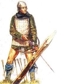 Un exemple type d'un archer anglais. On remarque une légère protection ventrale et le casque. À tout moment, les archers pouvaient être appelés à servir comme infanterie légère.