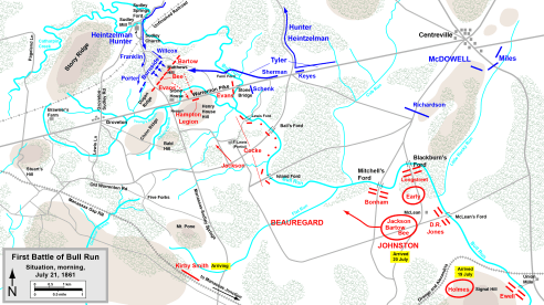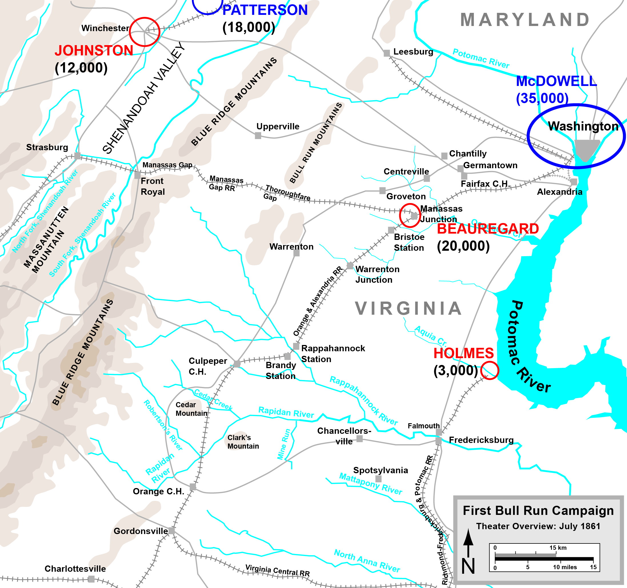 Répondant donc aux pressions de l’opinion publique, ordre fut donné aux forces inexpérimentées de l’Union du brigadier-général Irwin McDowell de faire marche vers Richmond en traversant la rivière Bull Run (voir la carte). En face, des forces confédérées tout aussi inexpérimentées sous les ordres du brigadier-général Pierre Beauregard marchaient vers le nord à la hauteur de la jonction ferroviaire de Manassas. La situation initiale était ambigüe, notamment parce qu’on demandait aux troupes d’exécuter des manœuvres compliquées que seules des forces régulières pouvaient normalement accomplir.