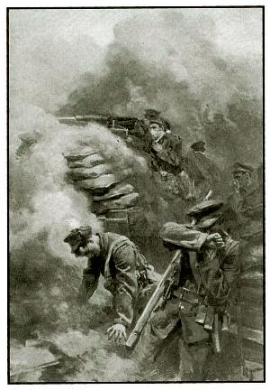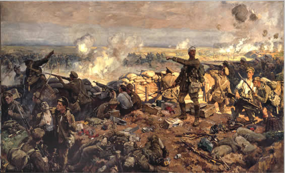 Célèbre tableau de l'artiste Richard Jack illustrant la Seconde bataille d'Ypres d'avril-mai 1915 en Belgique. Dans l'historiographie canadienne, on fait régulièrement référence à cet épisode comme la "Bataille de Saint-Julien". Ici, des soldats canadiens tentant d'arrêter un assaut allemand.