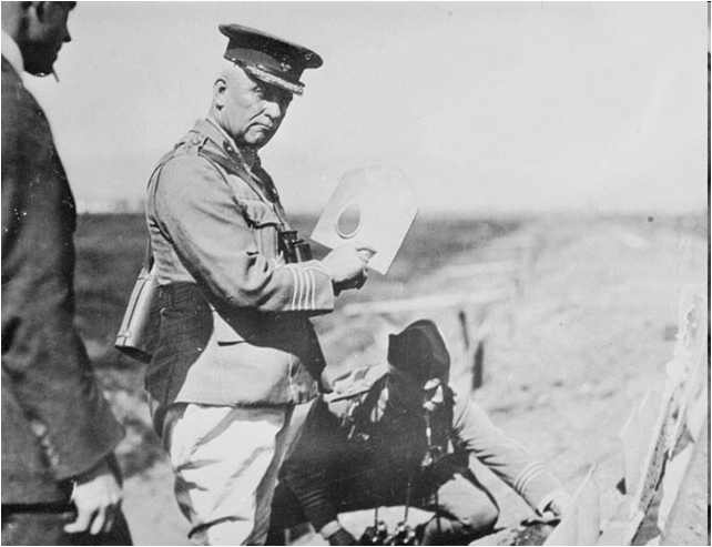 Le ministre de la Milice Sir Sam Hughes exhibant fièrement l'une de ses trouvailles: la pelle "MacAdam". Le soldat était censé pouvoir creuser un trou et, le cas échéant, insérer sa carabine à travers une ouverture spéciale, ce qui ferait en sorte de le "protéger" derrière la plaque métallique de la pelle.