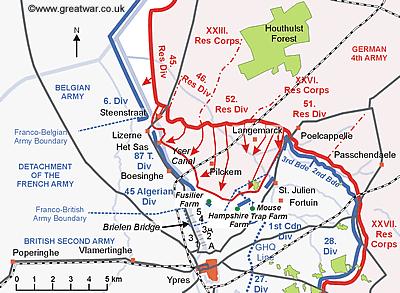 Les forces algériennes avaient rapidement reculé, prises de panique, laissant derrière elles un grand nombre de soldats tués ou suffoquant sous les effets du chlore. La situation était critique, car en reculant, les forces algériennes avaient laissé ouvert un large trou sur la ligne de front, si bien que la gauche de la division canadienne était à flanc ouvert et pouvait être prise à revers à tout moment. Dans le but de boucher le trou, les Canadiens ont dû rapidement se redéployer sur une nouvelle ligne de tranchées construites à la hâte le long de la route de Saint-Julien et Poelkapelle (voir la carte). Par conséquent, les Canadiens avaient dû étirer dangereusement leur front, au risque de l’amincir, le rendant ainsi plus vulnérable à d’éventuelles percées ennemies.