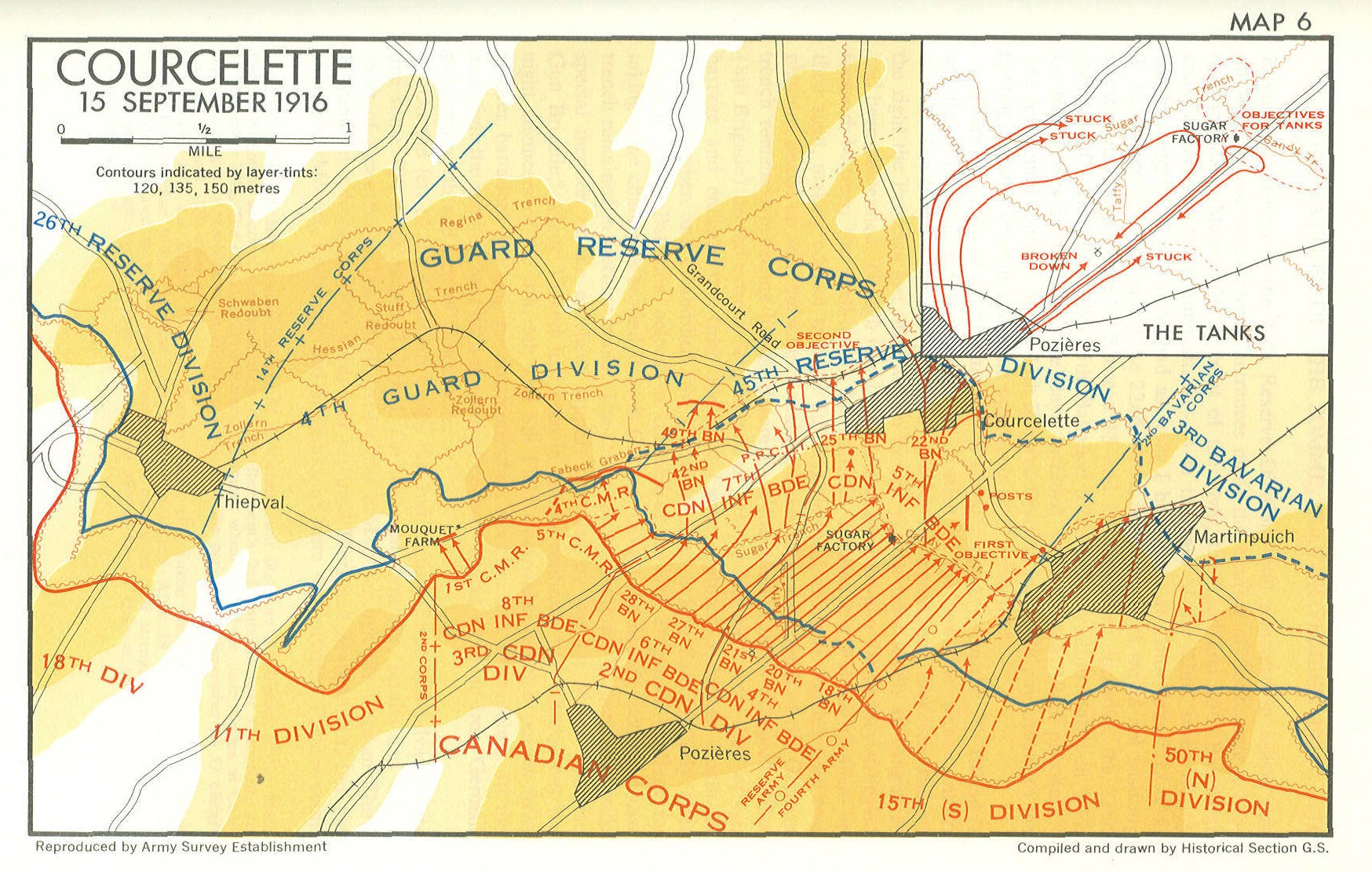 La bataille de la Somme pour le Canada s’était déroulée officiellement du 9 septembre au 28 novembre 1916, où les combats autour de Courcelette et des Tranchées Fabeck et Régina furent les épisodes importants de cet engagement. Les pertes canadiennes s’élevaient à 24,000 hommes. Trois Croix de Victoria avaient été décernées à des Canadiens et la nouvelle 4e Division avait relevé avec brio son premier baptême de feu, contribuant à son tour à la réputation d’agressivité du Corps canadien sur les champs de bataille d’Europe.