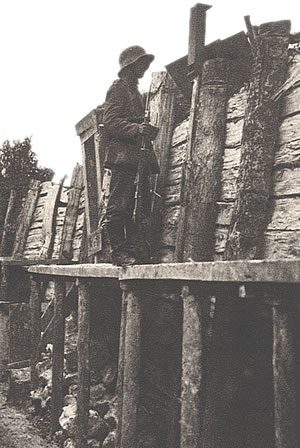 Un fantassin allemand observant le front dans une tranchée relativement profonde (Somme, 1916).