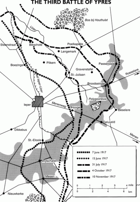 La carte jointe à ce texte illustre la lenteur de la progression des forces alliées durant la Troisième bataille d’Ypres, de juillet à novembre 1917. Par exemple, le 4 octobre, le 1er Corps d’armée australien avait capturé le village de Broodseinde sur une légère élévation à 6 kilomètres à l’est d’Ypres. Broodseinde se situait non loin de Passchendaele et le maréchal Haig était déterminé à capturer cette dernière position, car sa légère élévation dominait la région et le terrain y était beaucoup plus sec, permettant ainsi la manœuvre et de meilleures conditions pour les combattants.