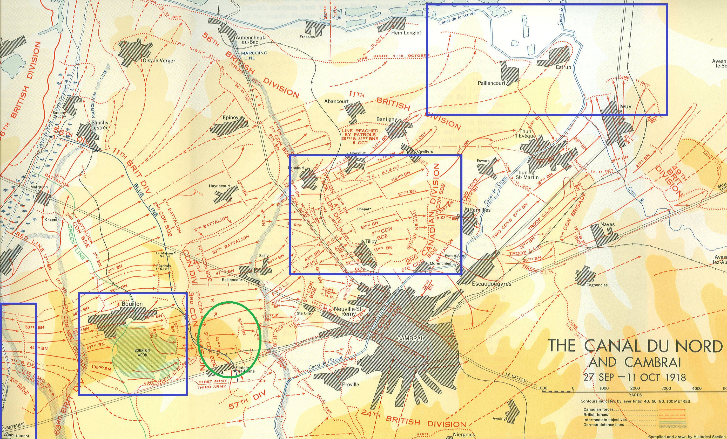 Plus haut, dans la chaîne de commandement, le maréchal Haig et son état-major préparaient la prochaine phase de l’offensive. Il était prévu que les 3e et 4e Armées britanniques prennent d’assaut la Ligne Hindenburg entre Cambrai au nord et Saint-Quentin au sud. Haig avait réservé au Corps canadien une mission complexe en plusieurs étapes. D’abord, traverser le Canal du Nord et capturer le Bois Bourlon. Ensuite, sécuriser les hauteurs au nord-est du Bois Bourlon, dont l’objectif d’ensemble était de protéger le flanc gauche de la 3e Armée britannique un peu plus au sud. Enfin, saisir les hauteurs au nord de Cambrai, de manière à poser une menace directe contre cette ville, un important centre de communications allemand à l’époque.