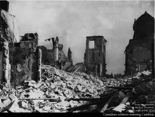 Les soldats canadiens entrent dans les ruines de Cambrai (octobre 1918).