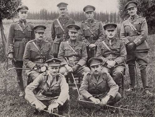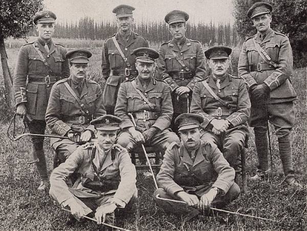 Au centre, le major-général Louis Lipsett. Né en Irlande et soldat de carrière, Lipsett commandait le 8e bataillon en 1915 puis la 3e Division canadienne en 1918. Il fut tué le 14 octobre 1918 alors qu'il commandait la 4e Division britannique. Figure très populaire auprès des Canadiens, avec lesquels il avait combattu depuis 1915, de nombreux soldats de son ancien 8e bataillon étaient présents à ses funérailles.