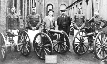 Exposition au début du XXe siècle en Angleterre des mitrailleuses Gardner, Maxim et Nordenfelt.