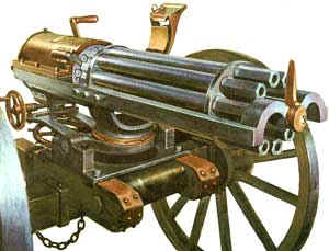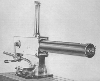 Le "canon-revolver" Hotchkiss de 37mm mis au point en 1879. Le fonctionnement de l'arme est inspiré du mécanisme de la mitrailleuse Gatling.