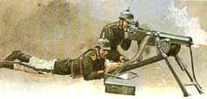 La version allemande de la mitrailleuse Maxim. La MaschineGewehr 1908, ou MG 08. Elle fut l'une des principales mitrailleuses utilisées par les Allemands pendant la Première Guerre mondiale.