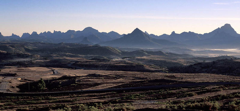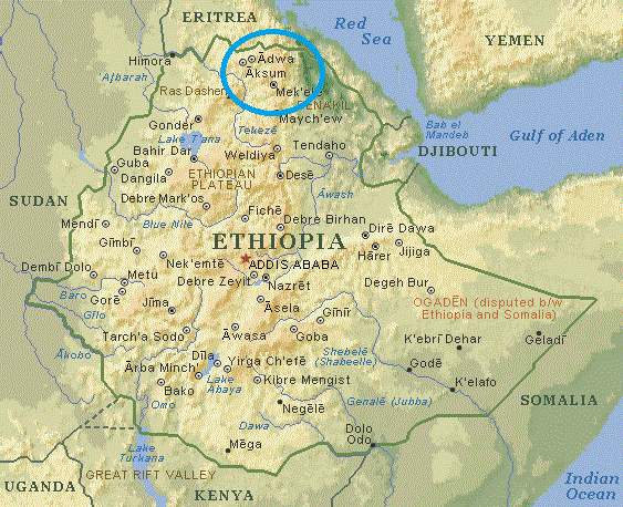 Carte de l'actuelle Éthiopie, dont le territoire composait autrefois une large partie de l'Afrique orientale italienne. Dans le cercle, le secteur où se déroula la bataille d'Adoua du 1er mars 1896.