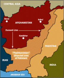 Carte montrant la délimitation de la frontière entre l'Afghanistan et le Pakistan basée sur la Durand Line de 1893.