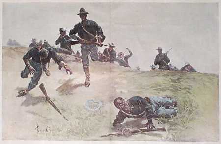 Illustration de soldats démontés du 9e Régiment de Cavalerie prenant part à l'assaut des hauteurs de San Juan (Cuba) lors de la guerre hispano-américaine de 1898.
