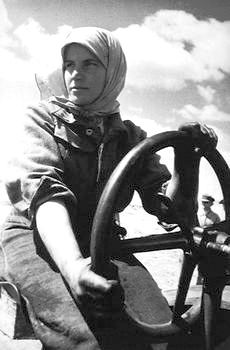 Photo de Simon Fridland idéalisant une femme soviétique conduisant un tracteur en 1932, dans le contexte de la collectivisation des terres agricoles dans l'URSS de Staline.