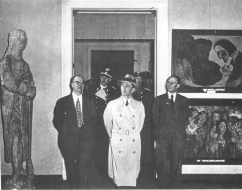 Le ministre Goebbels visitant l'exposition "Entartete Kunst" à Berlin le 27 février 1938. En arrière-plan, à droite, se trouvent des oeuvres de Macke et Nolde. Macke trouva la mort en 1914 au début de la Première Guerre mondiale, alors que Nolde était un membre du Parti nazi que Goebbels avait défendu lors de sa prise de position en faveur de l'expressionnisme avant 1936.