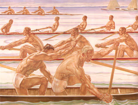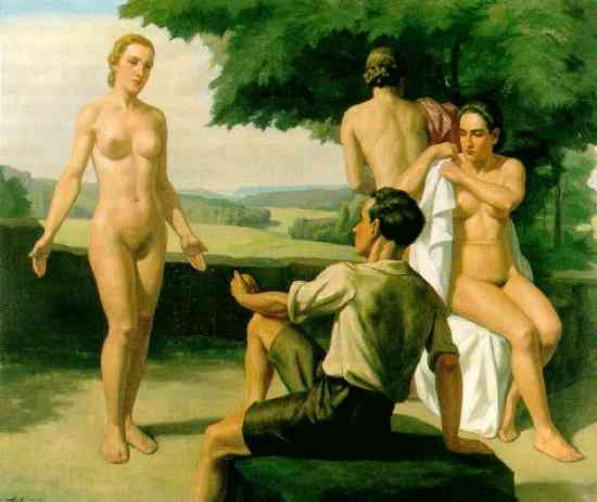 Finalement, on ne peut pas passer outre la production artistique faisant référence à la beauté aryenne, ce corps physique parfait et exalté par le régime. Selon Éric Michaud, c’est par la nudité que le « génie aryen » peut manifester son caractère éternel[54]. Ivo Saliger, dans Le Jugement de Paris (1939), met cette nudité parfaite de la femme à l’examen d’un homme habillé aux couleurs des S.A.. Cette toile classique appelle indirectement à la « procréation des individus de race aryenne », pour reprendre le vocabulaire de l’époque. Cette toile de Saliger, de même que celle d’Ernst Liebermann intitulée By the Water (sans date) et une autre d’Albert Janesh portant le titre de Sports aquatiques (1936), veut soulever ces fameuses passions que le peuple allemand doit découvrir afin de garantir sa survie. Ce dernier doit trouver la beauté de la vie dans un cadre où celle-ci joue un cercle vicieux, mais harmonieux avec le thème de la mort, du sacrifice pour la patrie. C’est à travers deux types de beauté, celle du corps féminin nu et propre et celle du corps masculin guerrier et sale, que se conçoit en autre le programme artistique des nazis.