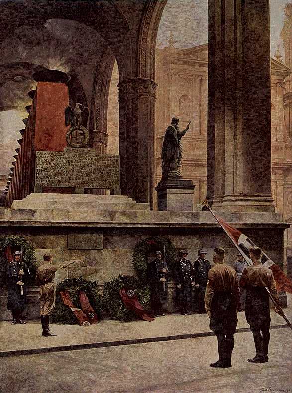 Toile anonyme et sans titre rappelant un événement important pour les nazis: le 9 novembre. C'est le 9 novembre 1923 que les nazis ont tenté, à Munich, de s'emparer du pouvoir lors du célèbre Beer Hall Putsch dans lequel 16 membres des Sections d'assaut (S.A.) périrent. À chaque année, les nazis rendirent hommage à ces S. A. tués au cours de ce putsch. On voit sur la toile Hitler déposer une gerbe de fleurs devant le monument funèbre consacré à ces S. A.