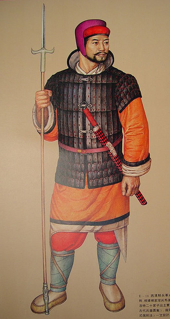 Les origines des premières forces militaires chinoises peuvent être retracées à l’époque de la dynastie Xia vers 2,000 avant notre ère. Il semble que les premiers combattants furent des aristocrates équipés d’arcs et d’armures en métal, et qui firent la guerre sur des chariots tirés par des groupes de quatre chevaux. À l’instar de ce qui se pratiqua dans d’autres civilisations, comme en Mésopotamie, ces combattants sur chariots furent régulièrement accompagnés de fantassins pour les protéger en pleine bataille. Ces derniers s’équipèrent typiquement de lances et certains revêtirent des armures en tissu rembourré de même que des boucliers.