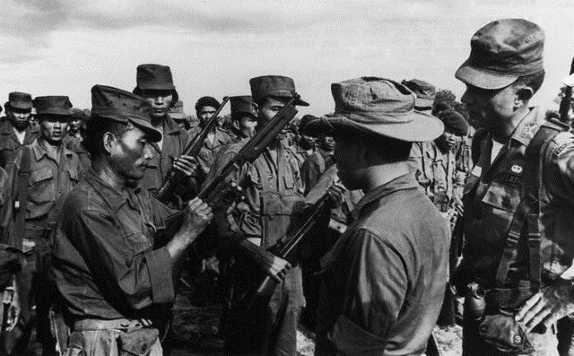 Des milliers de "conseillers militaires" américains furent dépêchés au Vietnam, avec pour mandats de brosser un portrait de la situation sur le terrain et de voir à la formation de l'Armée de la République du Vietnam (sud). Sur cette photo, des soldats sud-vietnamiens s'exerçant avec des armes américaines datant de la Seconde Guerre mondiale.