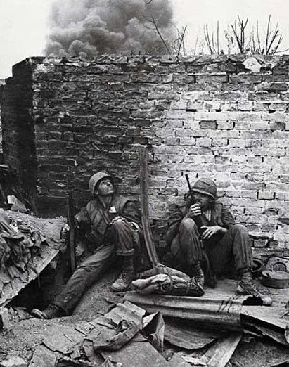 Des soldats américains pris sous le feu ennemi lors de l'offensive du Têt au début de 1968. Debout, un soldat exécute un tir de supression avec sa mitrailleuse lourde M-60, tandis qu'au téléphone, un officier discute probablement de la situation immédiate avec ses supérieurs.