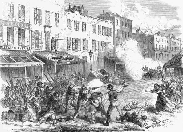 Estampe représentant les émeutes anti-conscriptionnistes de New York en juillet 1863. Les émeutiers (à gauche) affrontent les forces de l'ordre en pleine rue (à droite).