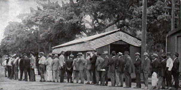 Dans le cadre de l'imposition de la conscription du type du service sélectif de 1917, des citoyens américains font la queue en réponse à l'appel des autorités militaires à Hawaii.