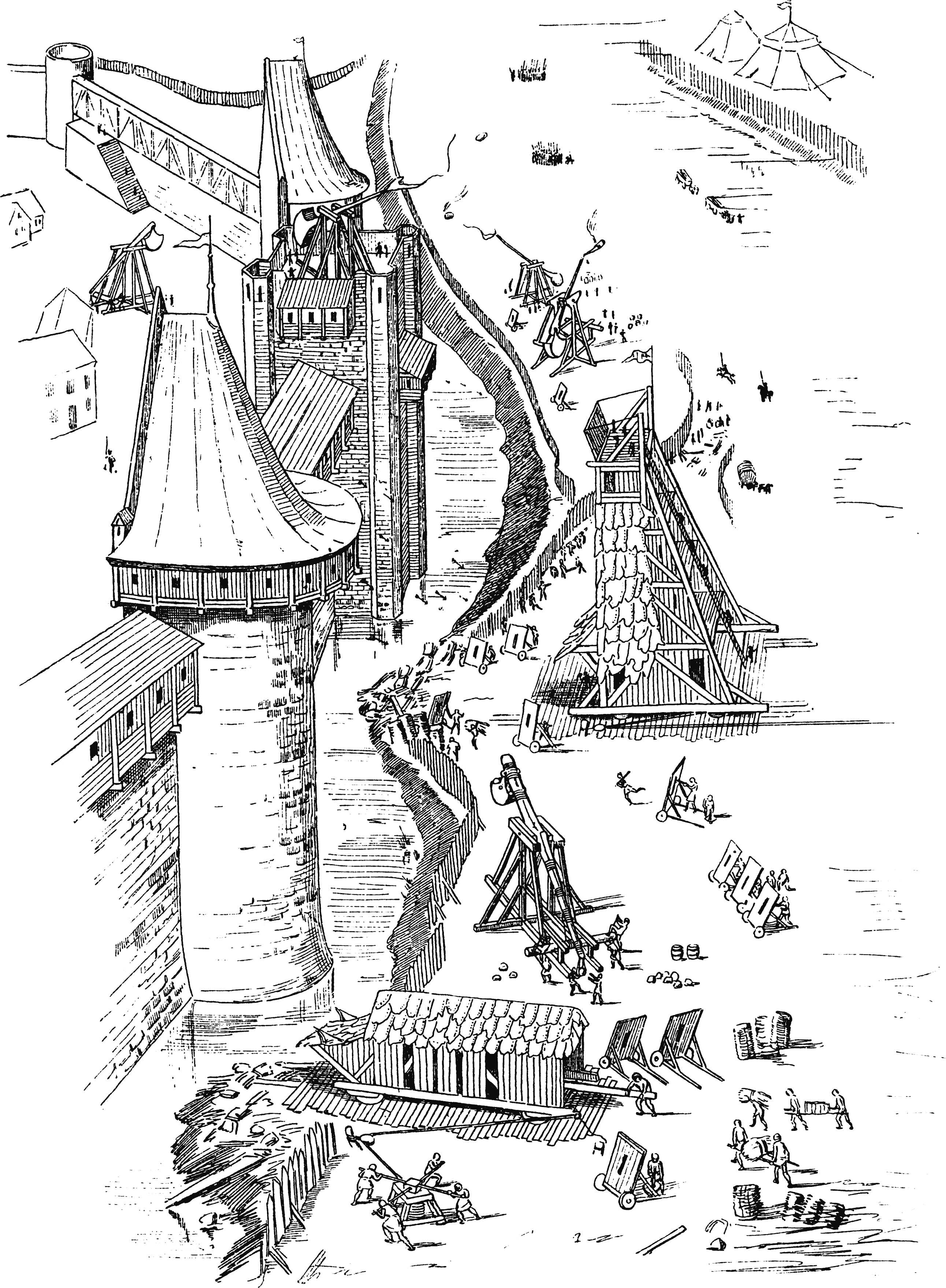 Croquis de profil d'une partie d'un château médiéval illustrant la difficulté, mais surtout la complexité logistique de toute opération de siège.