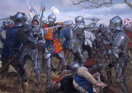 Peinture de Graham Turner représentant des chevaliers anglais combattant à pied (XVe siècle).