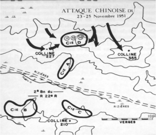 Le 21 novembre 1951, le 2e bataillon du R22R effectue une relève avec une unité de l’armée britannique. La compagnie D du 22e est installée sur une position en bas de la montagne, entre la colline 355, à droite, occupée par les Américains et la colline 227, à gauche, inoccupée.