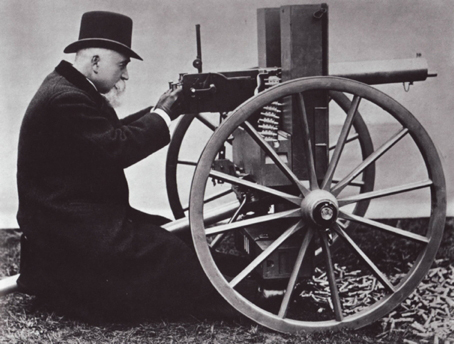 Pour paraphraser un ami de Sir Hiram Maxim: « Si tu veux faire de l’argent, invente une machine qui permettra aux Européens de s’entretuer. » C’est ce qu’il fit. Ici, Hiram Maxim posant avec sa mitrailleuse dans les années 1880. Il est considéré comme l’inventeur de la première mitrailleuse automatique telle qu’on la connaît de nos jours.